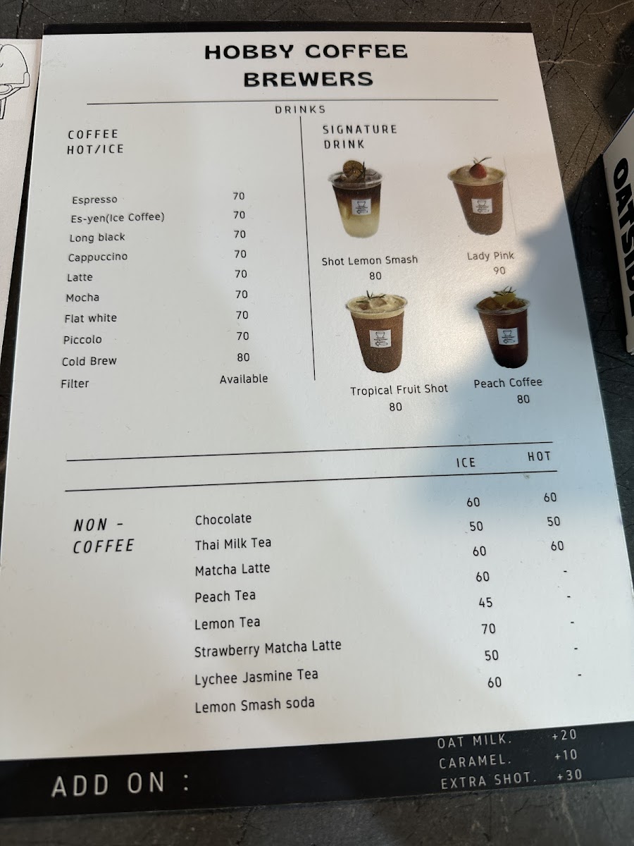 At Hobby Coffee Brewers, the air is infused with the rich aromas of freshly brewed coffee, inviting you to indulge your senses. The café's rich offerings include a variety of expertly prepared drinks—be sure to try their creamy hot latte, a customer favorite noted for its exceptional quality compared to even the best cafes in Bangkok! If you prefer something cooler, the iced long black and iced filter coffee come highly recommended by patrons, perfect for easing into a warm afternoon or rejuvenating during the humid Thai days.
